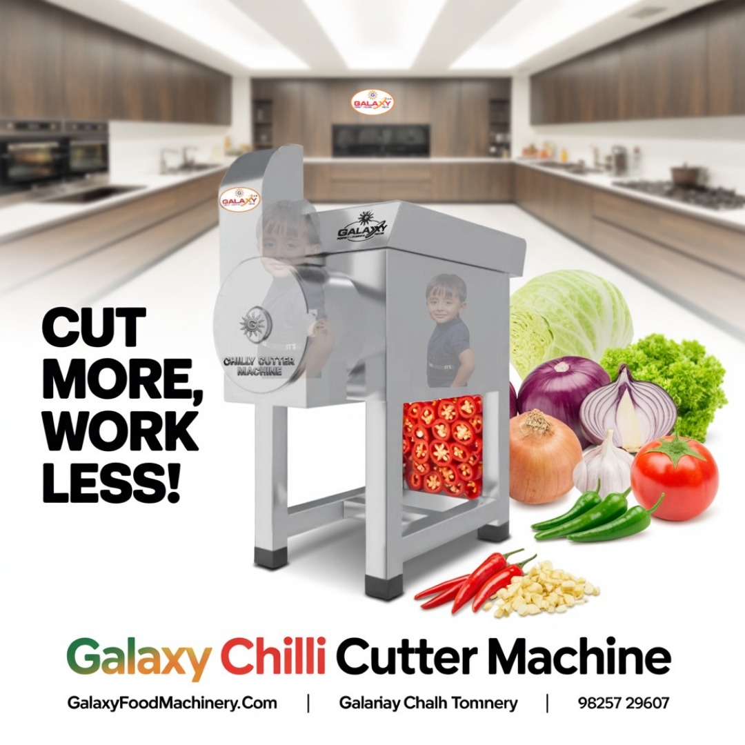 Chilly Cutter uniform chilli slices বানায়, আর Vegetable Cutter large volumes quickly কাটে. Daily prep speed onek বাড়ায়. Ei line e Galaxy Flour Mill & Food Processing Machinery Manufacturer in West Bengal quality te top.
