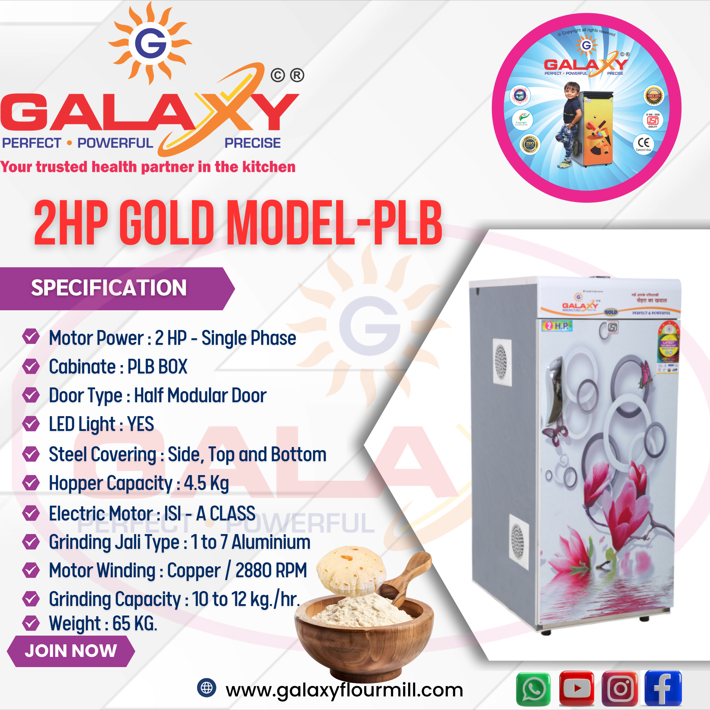 Galaxy offers high-quality domestic flour mill in Bhopal for families who want hygienic flour every day. Our automatic atta chakki makes grinding effortless with advanced stoneless technology and long-lasting copper winding motors.