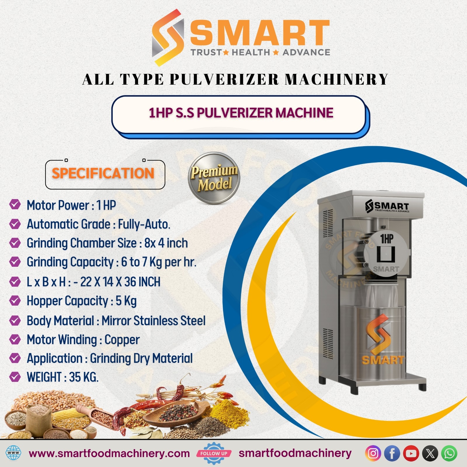 The 1 HP Stainless Steel Pulverizer Machine – Fully Automatic (Premium Model) is a compact and efficient grinding solution designed for small businesses, shops, and home-based food processing units. This machine delivers reliable performance with consistent grinding quality while maintaining low power consumption. Manufactured using a mirror-finish stainless steel body, the machine ensures hygienic grinding, corrosion resistance, and long-lasting durability. The strong 1 HP copper winding motor provides stable operation and smooth performance, making it ideal for daily grinding needs. The fully automatic system simplifies operation, reduces manual effort, and ensures efficient production, making this machine suitable for continuous small-scale commercial use. Key Features : • 1 HP powerful motor • Fully Automatic operation • Premium compact model • Grinding capacity 6 to 7 kg per hour • Mirror-finish stainless steel body • Copper winding motor for long life • Low power consumption • Smooth and low-noise performance • Strong and durable machine structure • Easy to operate and maintain Applications : • Masala and spice grinding • Grain and pulse grinding • Flour and besan grinding • Dry food material grinding • Small shops and home businesses • Commercial and domestic use Usage : • Place the machine on a stable and level surface • Connect to proper electrical power supply • Ensure materials are clean and dry • Start the machine using the control switch • Feed materials gradually into the hopper • Allow the machine to grind automatically • Collect the finished product from the container • Clean the machine regularly for best performance