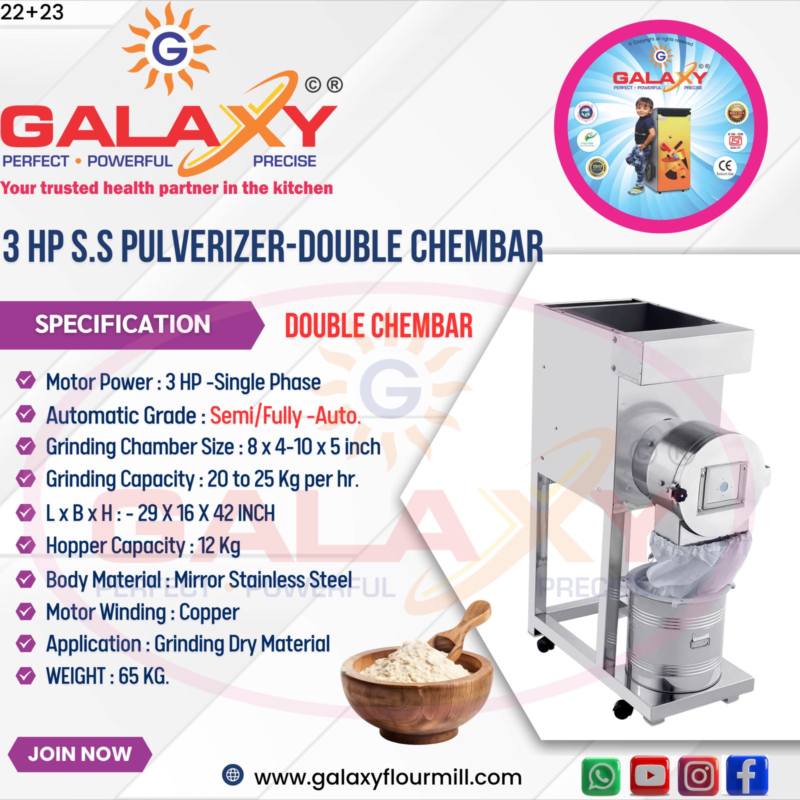 The 3 HP Stainless Steel Pulverizer Machine – Double Chamber (Semi Automatic) from Galaxy Flour Mill & Food Machinery is a high-capacity grinding machine designed for commercial shops, flour mills, and small-scale industries. This model features a double chamber grinding system, which improves productivity, reduces load on the motor, and ensures faster and more efficient grinding performance. Manufactured using mirror-finish stainless steel, the machine provides hygienic processing, corrosion resistance, and long-lasting durability. The powerful 3 HP copper winding motor delivers stable operation and consistent output, making it suitable for continuous commercial grinding of various dry materials. This semi-automatic double chamber pulverizer is an ideal solution for businesses that require higher capacity, reliable performance, and smooth operation for daily grinding work. Key Features : • 3 HP powerful motor – Single Phase • Double chamber grinding system • Semi-Automatic operation • Mirror-finish stainless steel body • Copper winding motor for long service life • High grinding efficiency with better output • Heavy-duty and durable machine structure • Smooth and low-vibration performance • Easy maintenance and user-friendly design • Suitable for continuous commercial use Applications : • Flour mill and food processing units • Spice and masala grinding • Grain and pulse grinding • Besan and flour grinding • Herbal and Ayurvedic product grinding • Dry material grinding • Commercial shop and small industry use Usage : • Place the machine on a stable and level surface • Connect the machine to proper electrical power supply • Ensure materials are clean and completely dry • Start the machine and allow it to reach full speed • Feed material gradually into the hopper • Collect the finished product from the container • Switch off the machine after use • Clean the machine regularly for long-lasting performance