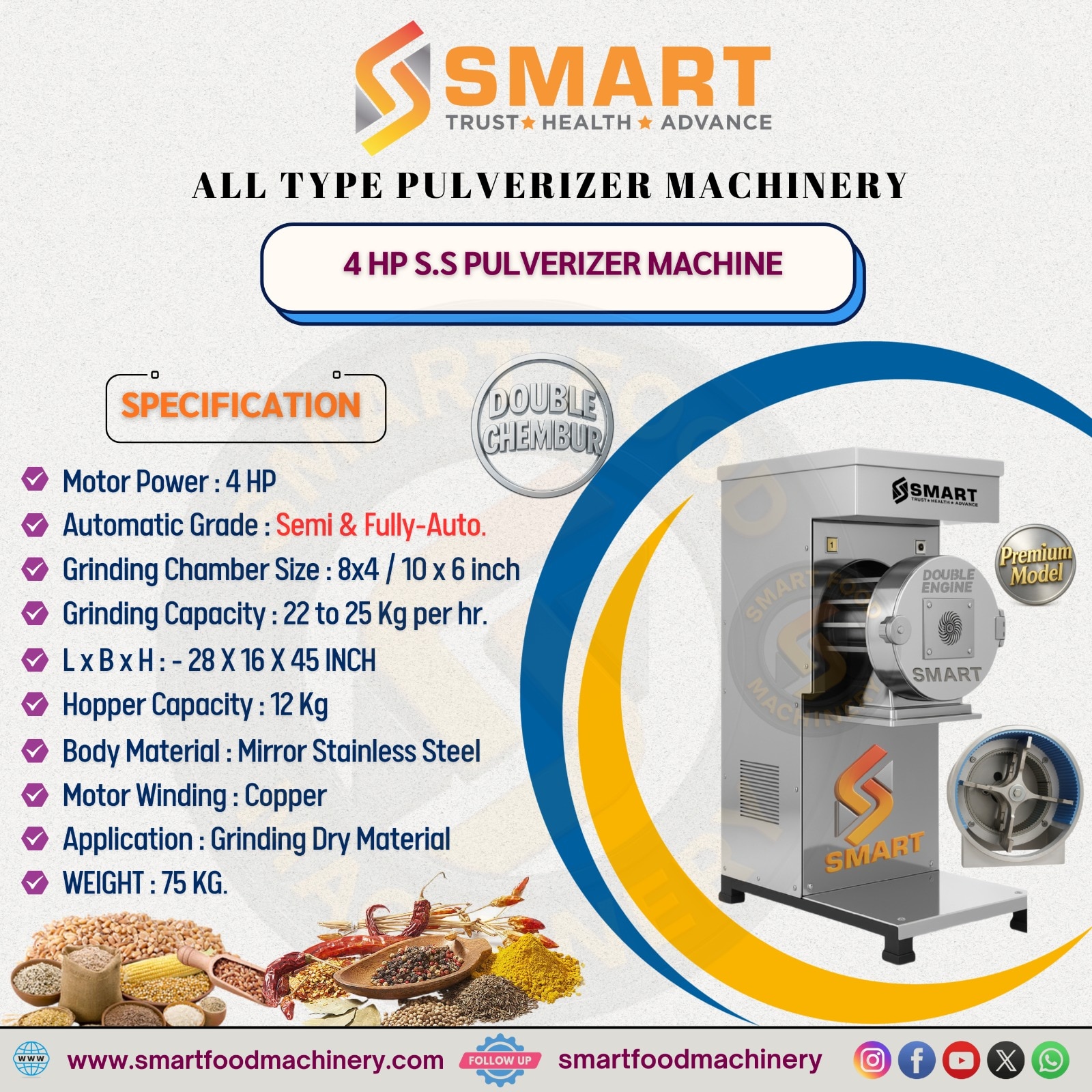 The 4 HP Stainless Steel Pulverizer Machine – Double Chamber – Fully Automatic (Premium Model) is a heavy-duty grinding machine designed for commercial flour mills, masala manufacturing units, and food processing industries that require high production capacity and continuous operation. This machine is equipped with a double chamber (double engine) system, which significantly improves grinding speed and productivity compared to single-chamber models. Manufactured with a mirror-finish stainless steel body, it ensures hygienic processing, corrosion resistance, and long service life. The powerful 4 HP copper winding motor delivers stable performance and consistent grinding output for demanding commercial applications. The fully automatic system enhances efficiency, reduces manual handling, and allows smooth continuous grinding, making it an ideal solution for professional and industrial grinding operations. Key Features : • 4 HP powerful motor • Fully Automatic operation • Double Chamber (Double Engine) system • Grinding capacity 22 to 25 kg per hour • Mirror-finish stainless steel body • Copper winding motor for long service life • Heavy-duty premium model • Strong and durable machine structure • Smooth and low-vibration performance • Designed for continuous commercial use Applications : • Spice and masala grinding • Grain and pulse grinding • Flour and besan production • Dry food material grinding • Commercial flour mills • Food processing industries • Medium and large-scale businesses Usage : • Place the machine on a stable and level surface • Connect to proper electrical power supply • Ensure materials are clean and dry before grinding • Start the machine using the control switch • Feed materials gradually into the hopper • Allow the machine to grind automatically • Collect the finished product from the container • Clean the machine regularly for long-lasting performance