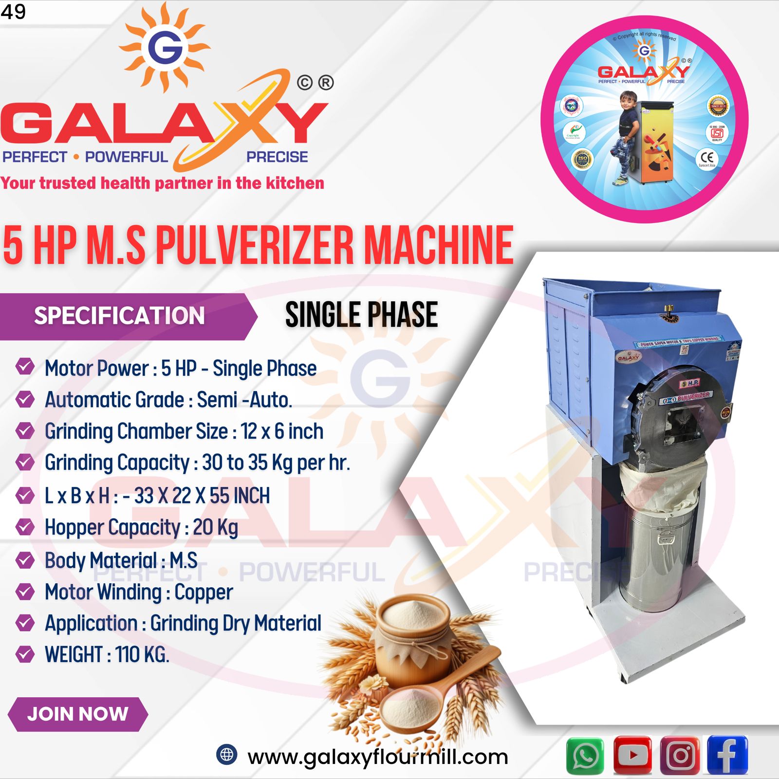 The 5 HP M.S Pulverizer Machine (Single Phase) from Galaxy Flour Mill & Food Machinery is a reliable and efficient grinding solution designed for processing various dry materials such as grains, spices, pulses, and food ingredients. This semi-automatic pulverizer is ideal for small to medium-scale businesses that require consistent grinding performance with dependable output quality. With a grinding capacity of approximately 30 to 35 kg per hour, the machine helps improve productivity while maintaining uniform powder consistency. Manufactured with a durable Mild Steel (M.S) body, this pulverizer ensures long-lasting performance, strong structure, and stability during continuous operation. The machine operates on a 5 HP single-phase motor with copper winding, providing better efficiency, smoother performance, and extended motor life. Its compact and sturdy design makes it suitable for flour mills, spice grinding units, and commercial food processing businesses. The Galaxy 5 HP M.S Pulverizer (Single Phase) is an excellent choice for businesses looking for a dependable, energy-efficient, and cost-effective grinding machine for daily commercial use. Applications : • Flour mills and atta chakki units • Spice and masala grinding businesses • Food processing industries • Grain and pulse grinding units • Small-scale manufacturing businesses • Commercial grinding operations • Agricultural product processing units • Retail and wholesale food production units Usage : • Connect the machine to a proper single-phase power supply • Load dry materials such as grains, spices, or pulses into the hopper • Switch on the machine to start the grinding process • Allow the pulverizer to grind materials into fine powder • Collect the processed material from the outlet container • Adjust mesh or settings if different fineness levels are required • Clean the machine regularly to maintain hygiene and long service life