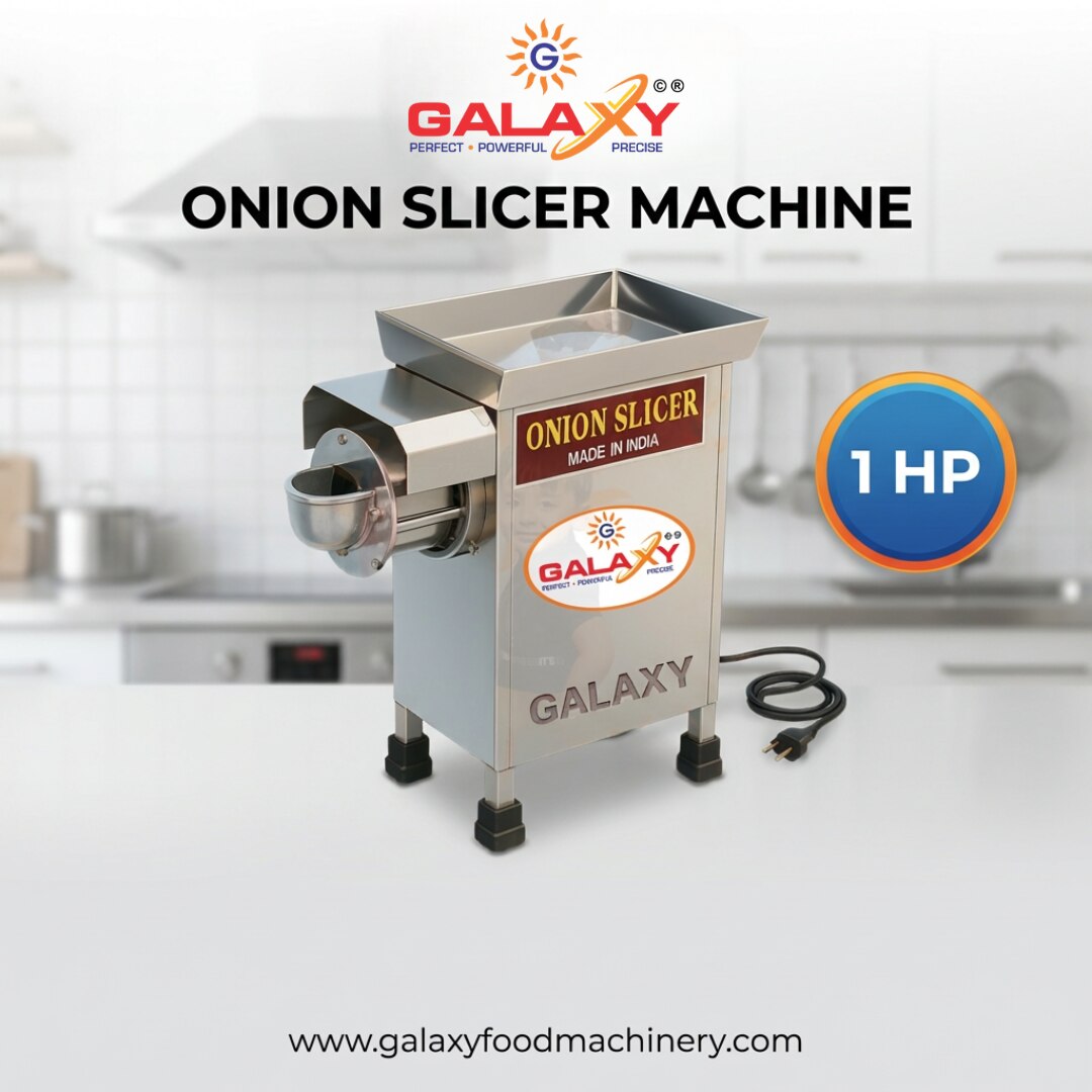 The Commercial Onion Slicer Machine by Galaxy Flour Mill & Food Machinery is designed to deliver fast, uniform, and efficient onion slicing for commercial kitchens and food processing businesses. This powerful machine is equipped with a 1 HP motor that ensures smooth and continuous operation, making it ideal for high-demand environments such as hotels, restaurants, catering services, and food manufacturing units. With a production capacity of 125–150 kg per hour, this machine significantly reduces manual labor and preparation time while maintaining consistent slice quality. The stainless steel body and stainless steel blade ensure durability, hygiene, and long-lasting performance. Its manual control system makes the machine simple to operate and maintain, while the compact design allows easy installation in commercial kitchens. The Onion Slicer Machine from Galaxy Flour Mill & Food Machinery enhances productivity, improves efficiency, and ensures uniform slicing results every time. Applications : • Hotels and Restaurants • Catering Services • Commercial Kitchens • Food Processing Units • Fast Food Centers • Cloud Kitchens • Vegetable Processing Businesses • Onion Packaging Units Usage : Prepare Onions : Peel and clean the onions before feeding them into the machine. Load Onions : Place the onions into the feeding chamber of the machine. Start the Machine : Turn on the machine to begin slicing operation. Collect Slices : Uniform onion slices will automatically come out from the outlet. Clean After Use : Switch off the machine and clean the blade and body to maintain hygiene and performance.