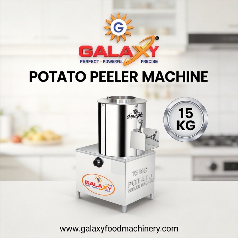 A Commercial Potato Peeler Machine by Galaxy Flour Mill & Food Machinery is designed to deliver fast, efficient, and hygienic peeling of potatoes for commercial kitchens and food processing businesses. This compact yet powerful machine is ideal for hotels, restaurants, catering services, canteens, and snack manufacturing units that require quick preparation of peeled potatoes with minimal manual effort. With a capacity of 15 kg per batch and a peeling time of approximately 5 to 7 minutes, it helps save labor time and improves operational productivity. Manufactured with a durable stainless steel body, the machine ensures long-lasting performance, corrosion resistance, and easy cleaning for daily commercial use. Its reliable motor provides smooth operation and consistent peeling results, making it suitable for continuous kitchen and industrial applications. The machine is designed to maintain hygiene standards while increasing efficiency, making it an essential solution for businesses handling regular potato processing tasks. The Potato Peeler Machine from Galaxy Flour Mill & Food Machinery is a dependable and cost-effective choice for businesses seeking consistent performance, durability, and improved food preparation efficiency. Applications : • Hotels and restaurants • Catering services • Commercial kitchens • Food processing industries • Potato chips and snack manufacturing units • Cloud kitchens and central kitchens • Hostels, canteens, and mess facilities • Small and medium-scale food production units Usage : • Wash potatoes thoroughly to remove dirt and impurities • Load potatoes into the machine drum • Start the machine to begin the peeling process • Allow the machine to peel potatoes within 5 to 7 minutes • Remove peeled potatoes from the outlet • Rinse potatoes if required before further processing • Clean the machine after use to maintain hygiene and long machine life
